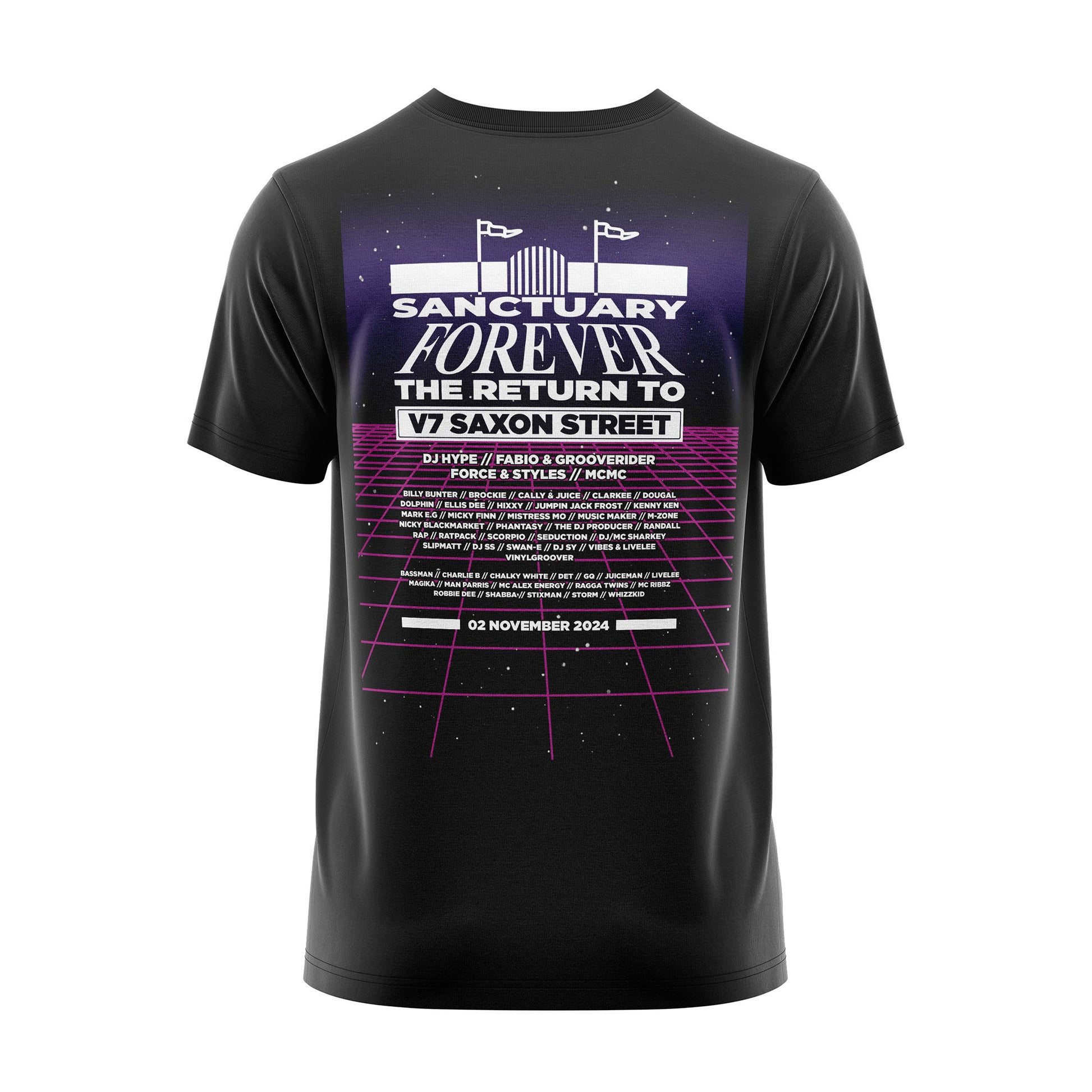 Introducing the official Sanctuary Forever Part 1 Line-up T-shirt—celebrating the unforgettable return of the biggest 90s rave reunion in two decades. This premium-quality tee is more than just clothing; it's a tribute to the iconic energy of V7 Saxon Street. Featuring bold designs that capture the raw, underground spirit of the 90s rave scene, this T-shirt is perfect for ravers who want to carry the legacy of Sanctuary Forever wherever they go. Comfortable, stylish, and exclusive, it's the ultimate piece of memorabilia for anyone who lived—or wished they lived—through the glory days of rave culture.